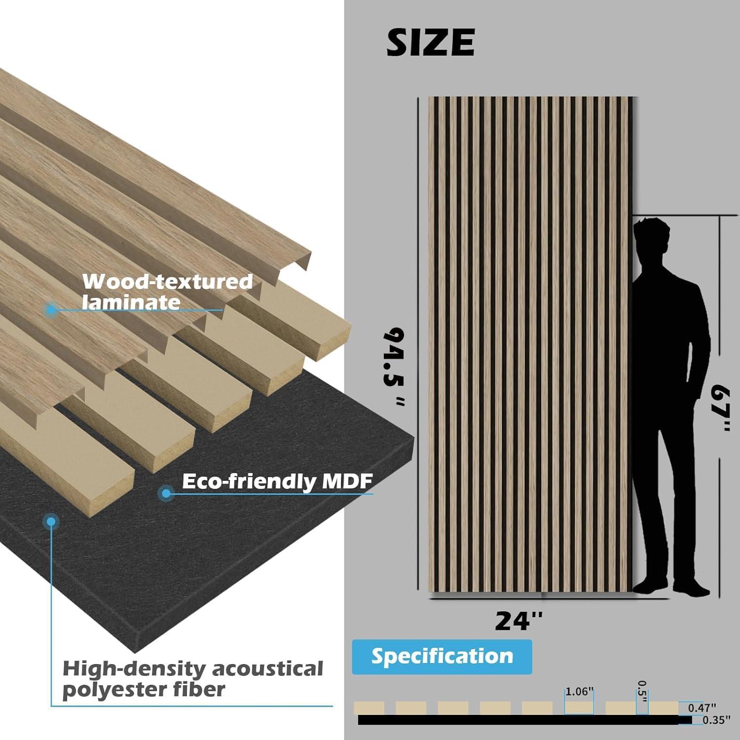 【Package Includes】- 2-pack acoustic wood slat wall panels, each measuring 94.5″ x 24″, covering approximately 31 sq.ft. Recommended to purchase a sample pack first to select the color and style for your project