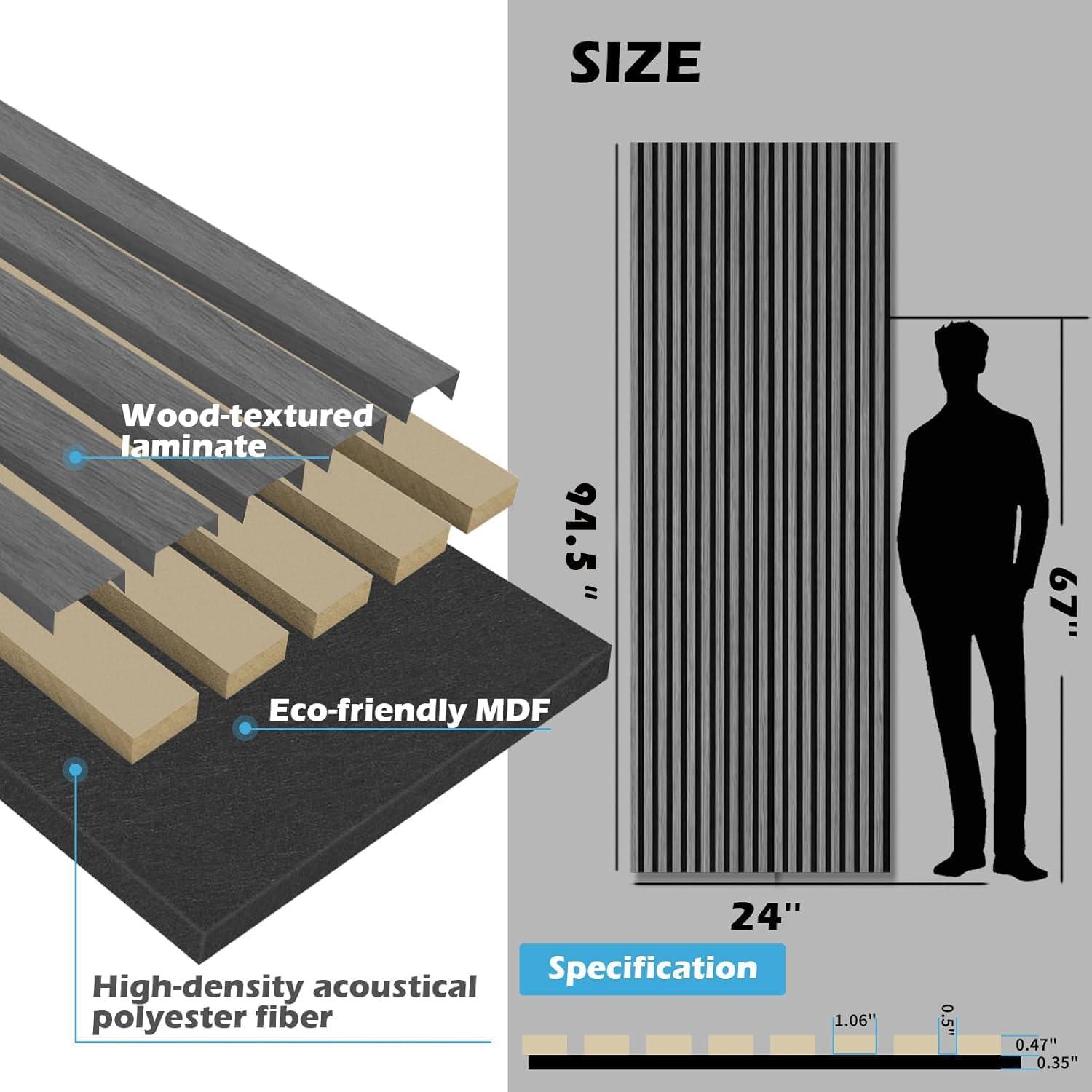 【Package Includes】- 2-pack acoustic wood slat wall panels, each measuring 94.5″ x 24″, covering approximately 31 sq.ft. Recommended to purchase a sample pack first to select the color and style for your project