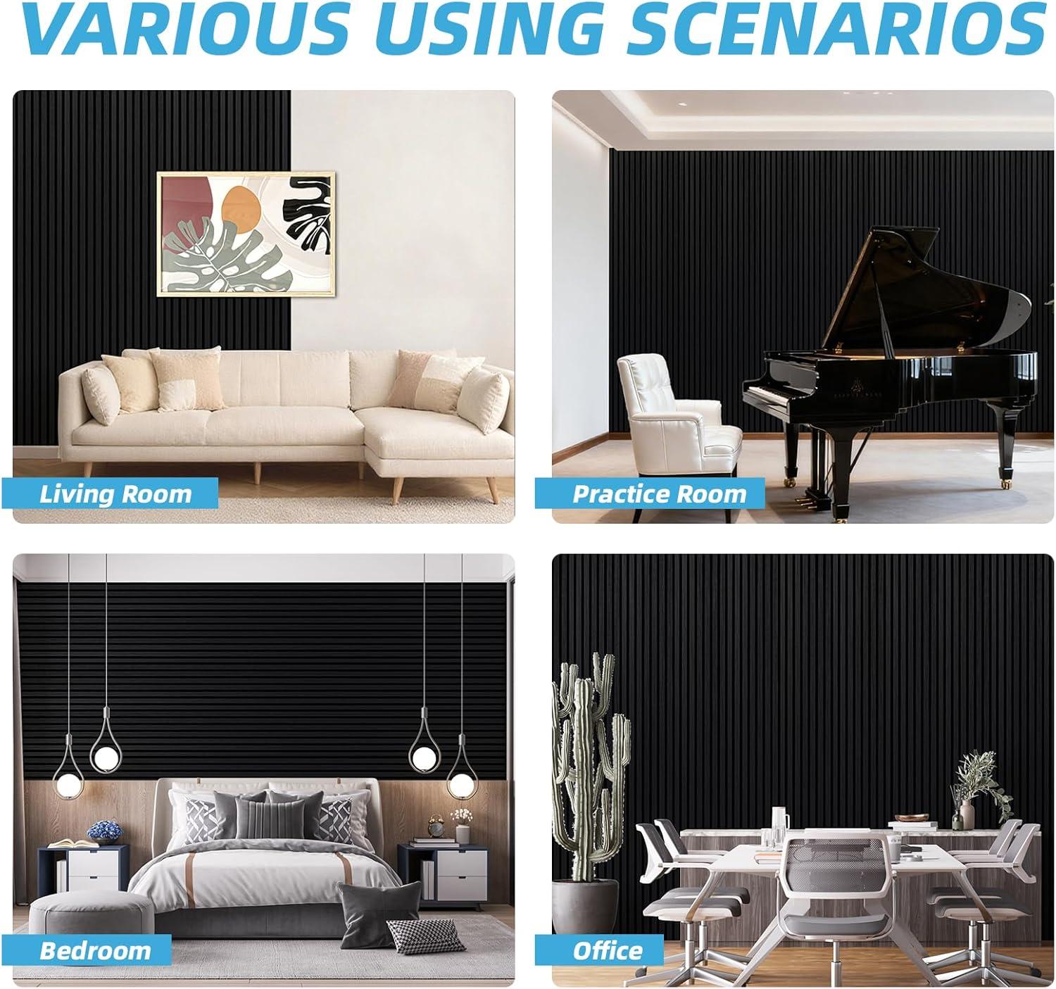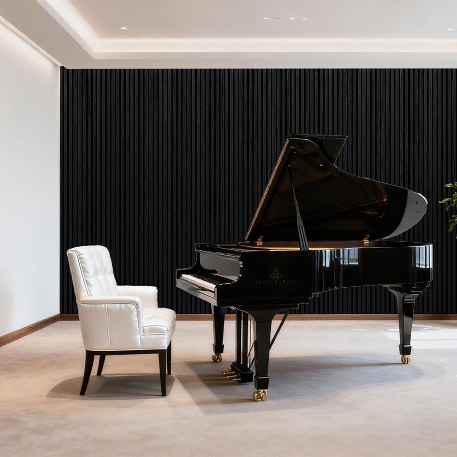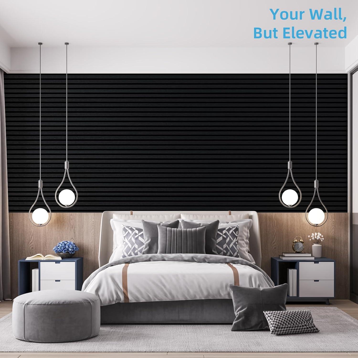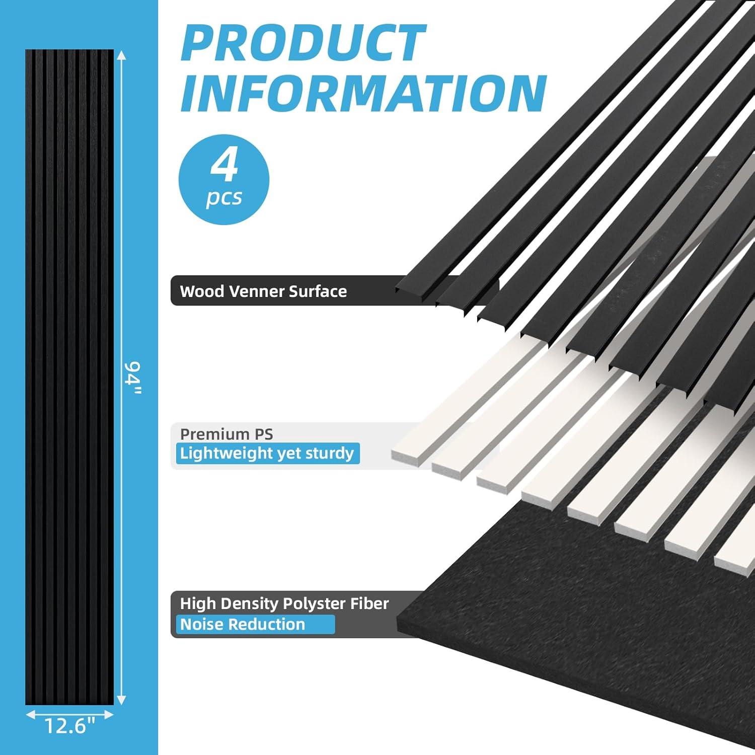 Art3d 4-Piece 94 x 12.6 Inch Acoustic Lightweight Slat Wall Panel - Waterproof Wood Textured Wainscoting Panel of 33 Sq.Ft for Bedroom, Home Theater Office Accent Wall, White Elm(Matte Black)